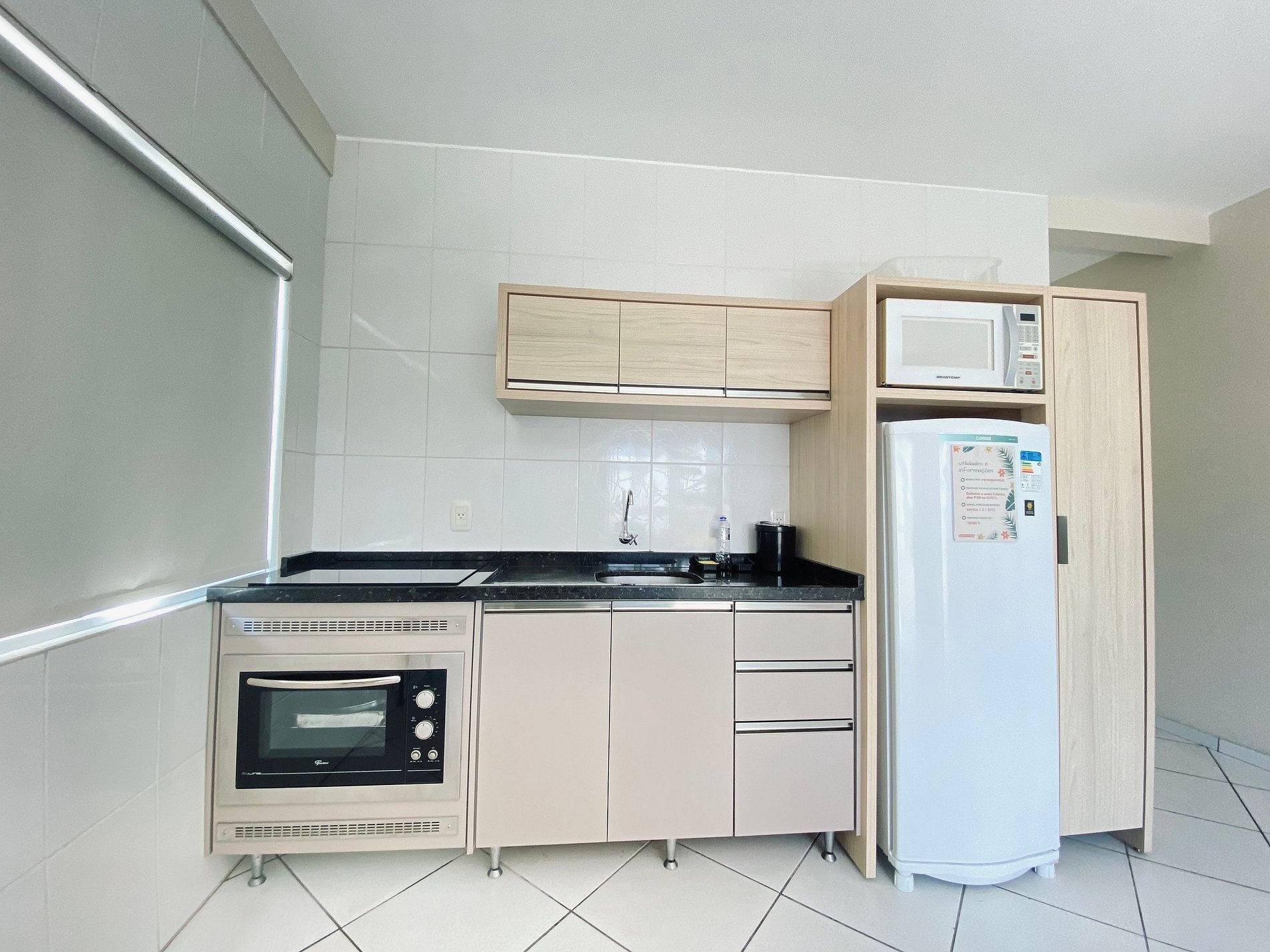 A cozinha é equipada com todos utensílios necessários para sua estadia, como forno elétrico, cooktop, micro-ondas, sanduicheira, liquidificador e cafeteira.. Também é oferecido aos hóspedes roupas de cama e banho, e a cada três dias é realizada a troca, para sua maior comodidade.